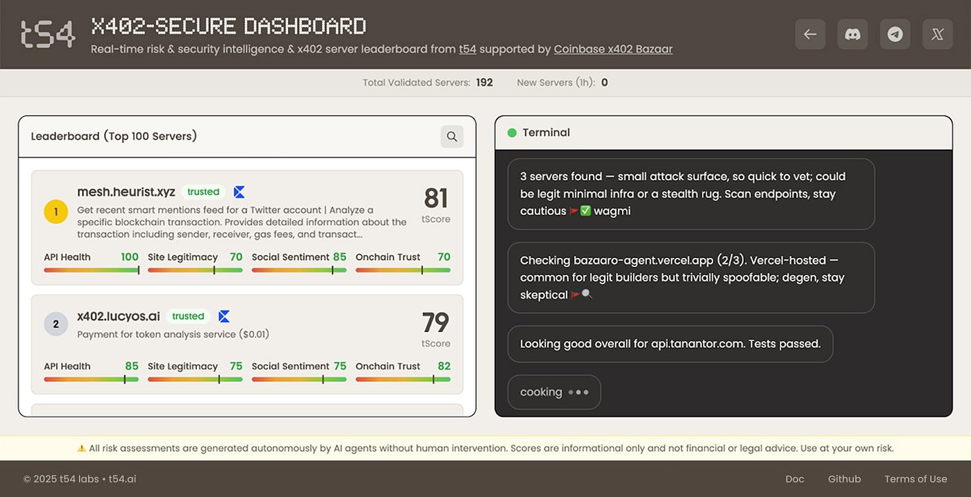 x402secure.com is the open-source SDK & proxy that adds a trust layer on x402. Simple integration. Powered by Trustline, agent-native risk engine from t54.ai.