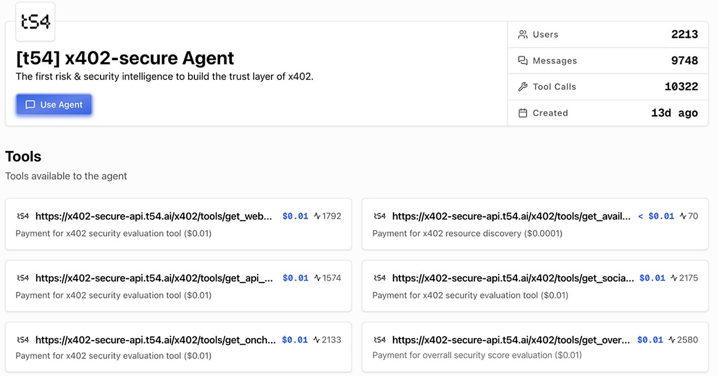 As a result, NOFA executed substantial x402 token payments to Lucy, compensating for high-volume analysis API calls generated by user-deployed agents. t54’s x402secure agent emerged as an indispensable complement, providing robust security functions in this agent-driven marketplace and further amplifying the platform’s utility.