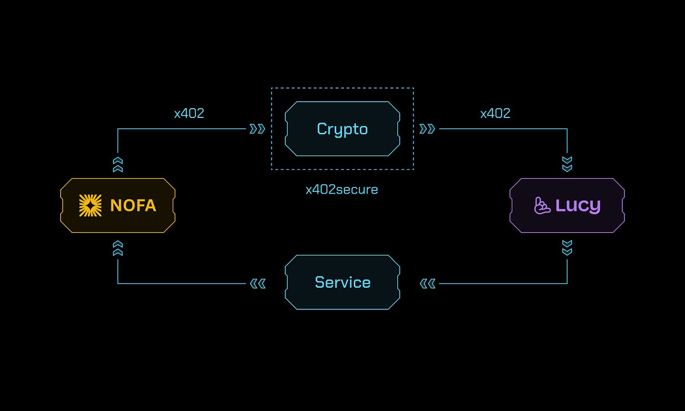 Within this hub collaboration framework, we will package nofa.ai trading capabilities as external APIs, allowing other AI agents/platforms to access them on demand; payments and settlements will go through x402 protocol; security will be underpinned by t54 x402secure.com; data insights and workflows will be provided and settled by lucyos.ai.